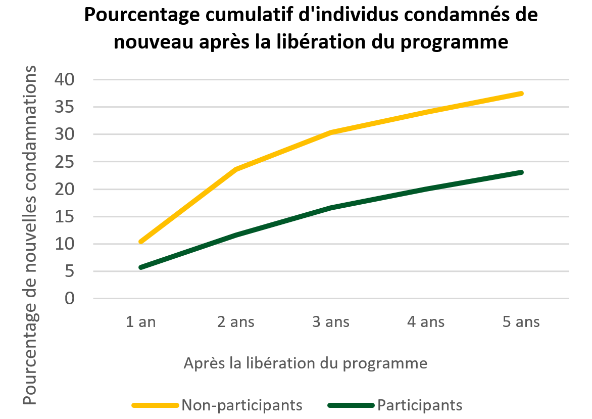 Une proportion plus élevée de non-participants ont été condamnés de nouveau au cours des cinq premières années après la libération du programme, tandis que les participants au programme étaient beaucoup moins susceptibles d’être condamnés de nouveau chaque année et 50 % moins susceptibles d’être condamnés de nouveau après cinq ans.